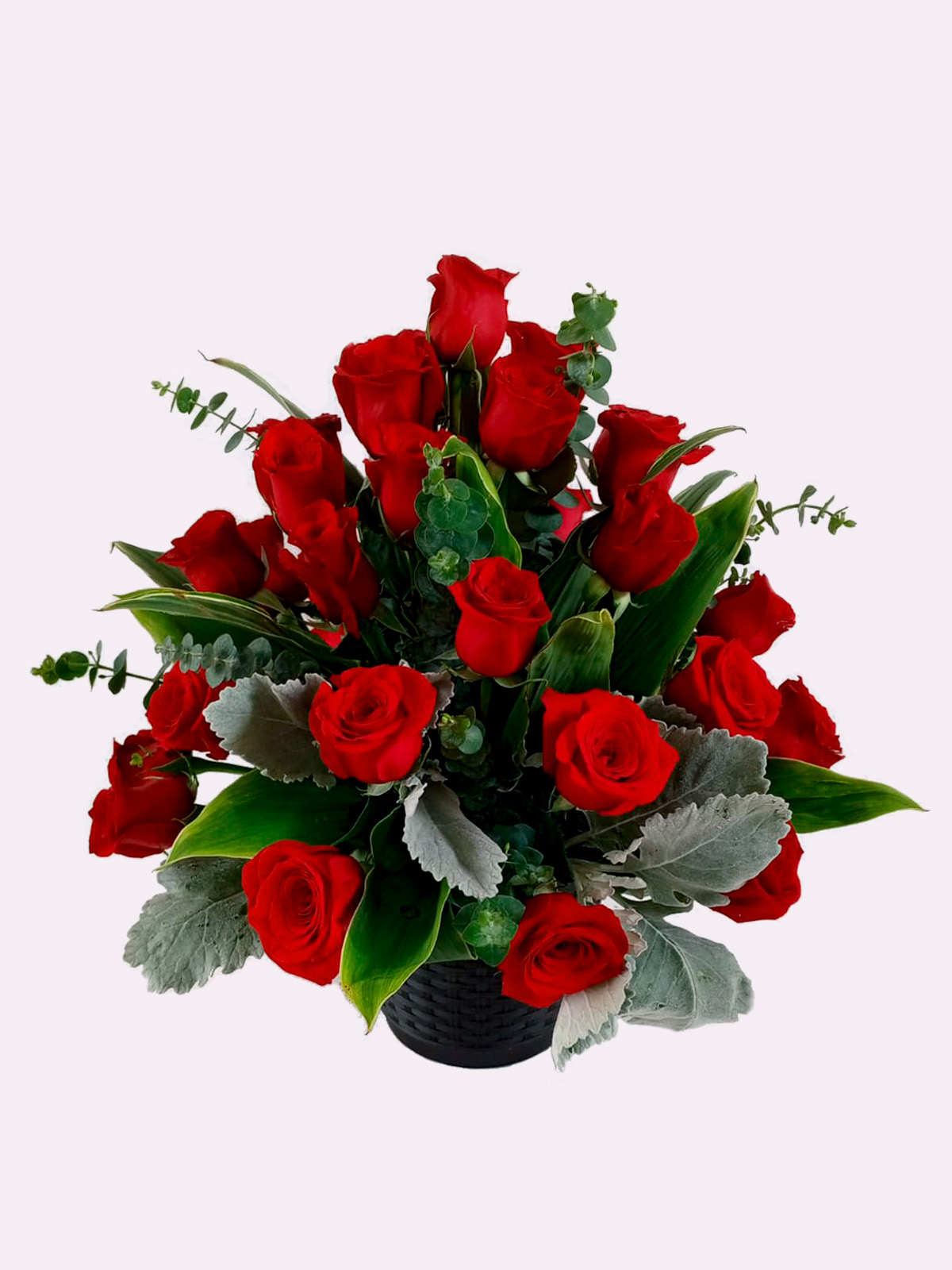 Este diseño floral es la personificación de la sofisticación clásica. Se compone de una selección de rosas rojas de exportación dispuestas con armonía entre hojas de eucalipto y follaje aterciopelado en tonos plata, creando una combinación de texturas única. Presentado en una discreta base negra tipo cesta, este arreglo es perfecto para quienes buscan un detalle romántico que destaque por su sobriedad y buen gusto. Su tamaño mediano lo hace ideal para cualquier rincón del hogar o la oficina.