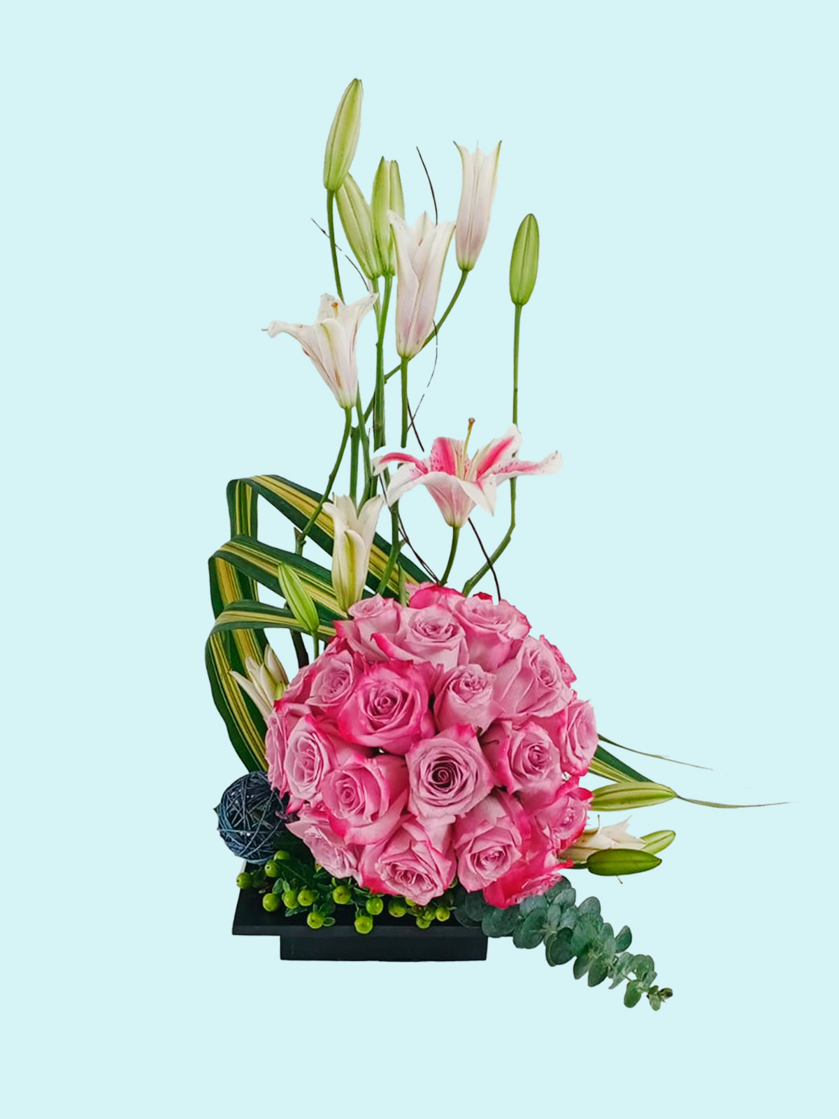 Añade un toque de ternura y sofisticación a cualquier espacio con este exclusivo diseño. Este arreglo destaca por su armonioso domo de rosas rosadas premium, que simbolizan el cariño y la gratitud. El diseño cobra vida con la altura y elegancia de los lirios blancos y rosados que emergen con gracia, creando una silueta esbelta y moderna. Es la elección perfecta para quienes buscan un detalle refinado, suave y lleno de luz para expresar sentimientos puros.