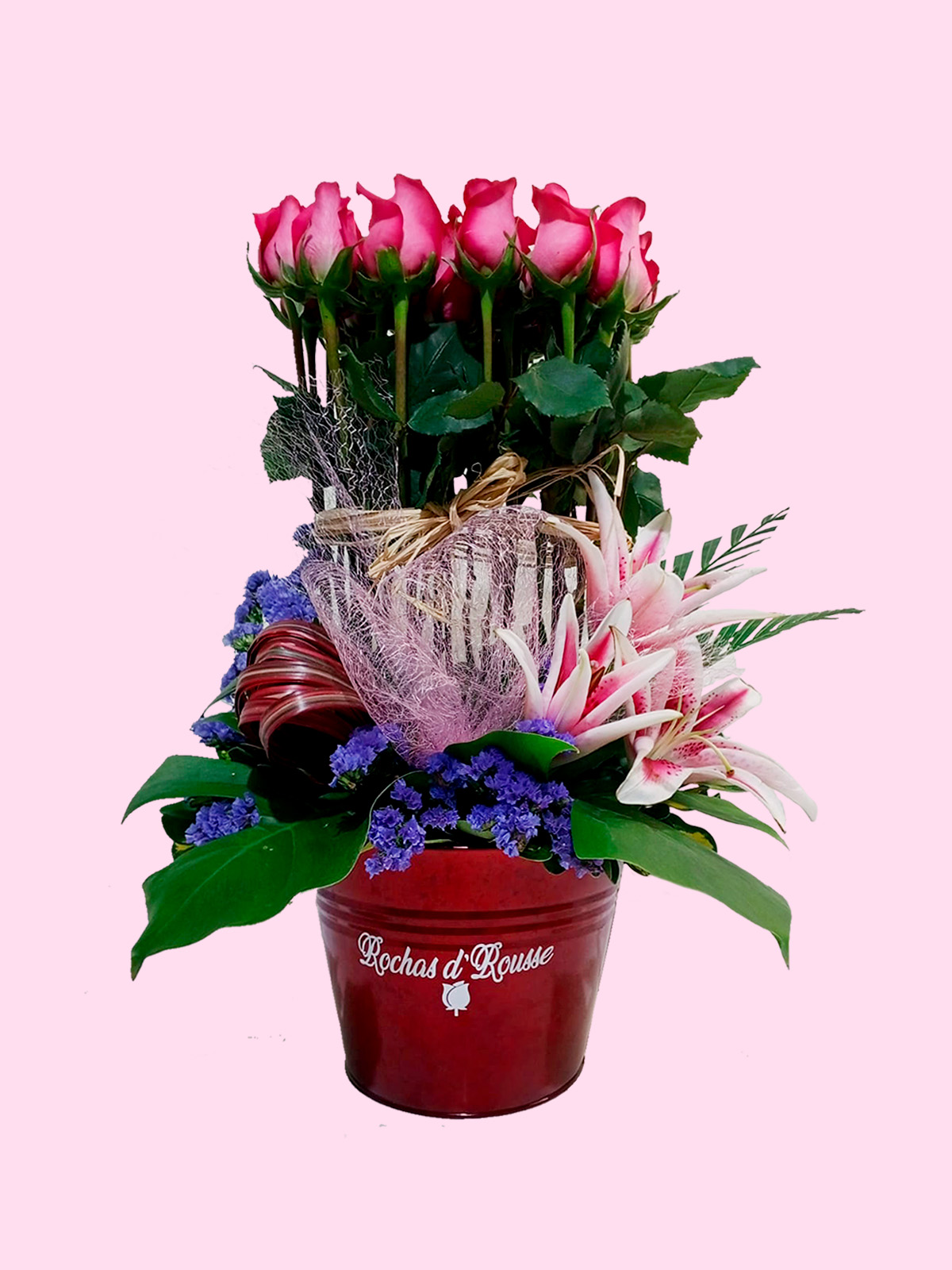 • Incluye: Rosas rosadas de alta calidad, lirios matizados, flores de statice morado, follaje decorativo, lazo y base de balde metálico brandeado.