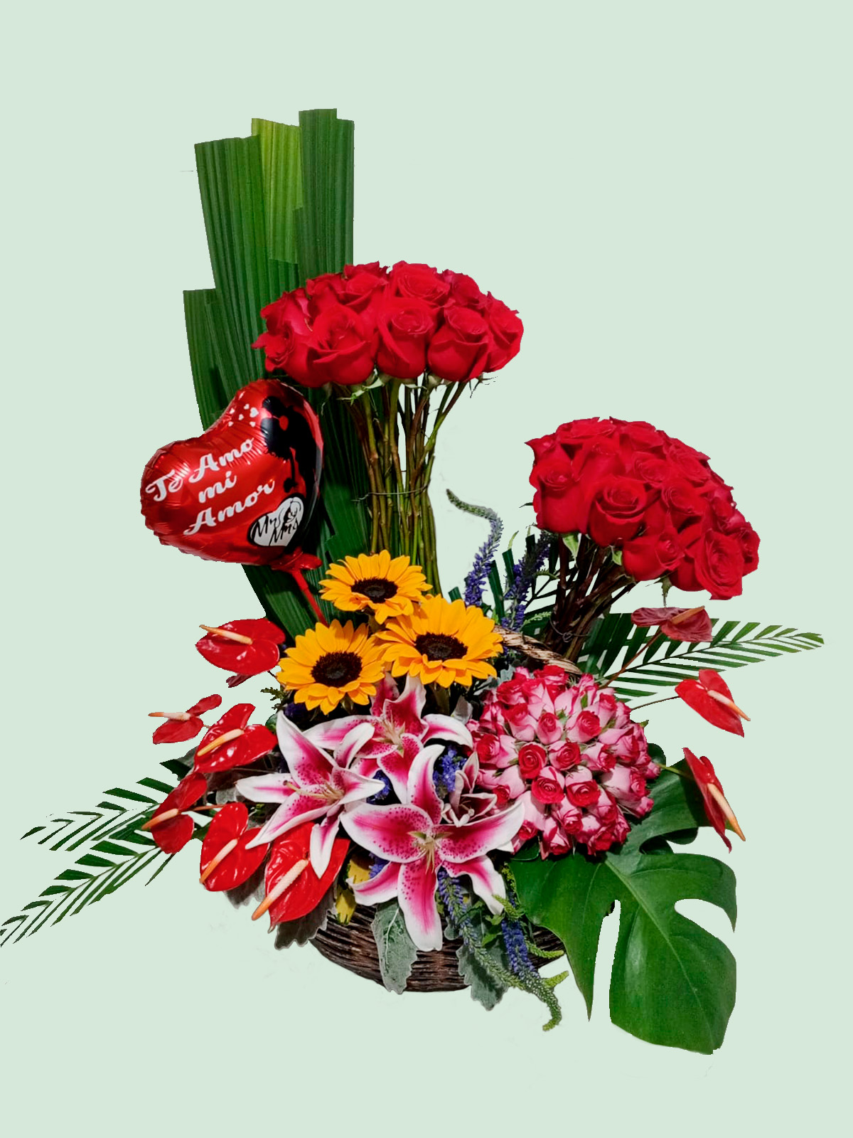 Incluye: Selección premium de rosas rojas, girasoles, lirios matizados, anturios rojos, follaje exótico (hoja de palma y monstera), globo temático de amor y base de canasta artesanal reforzada.