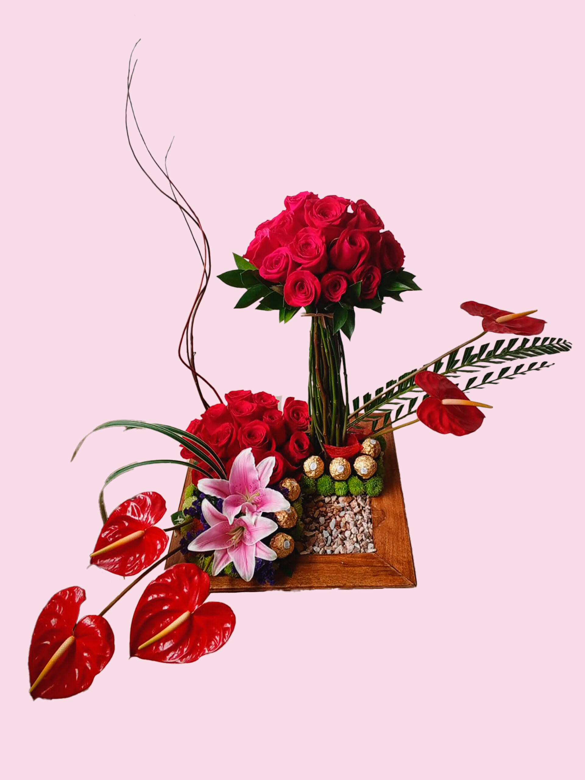 Incluye: Rosas rojas premium, anturios rojos, lirios rosados, bombones Ferrero Rocher, base de madera artesanal, piedras decorativas y follaje fino.
