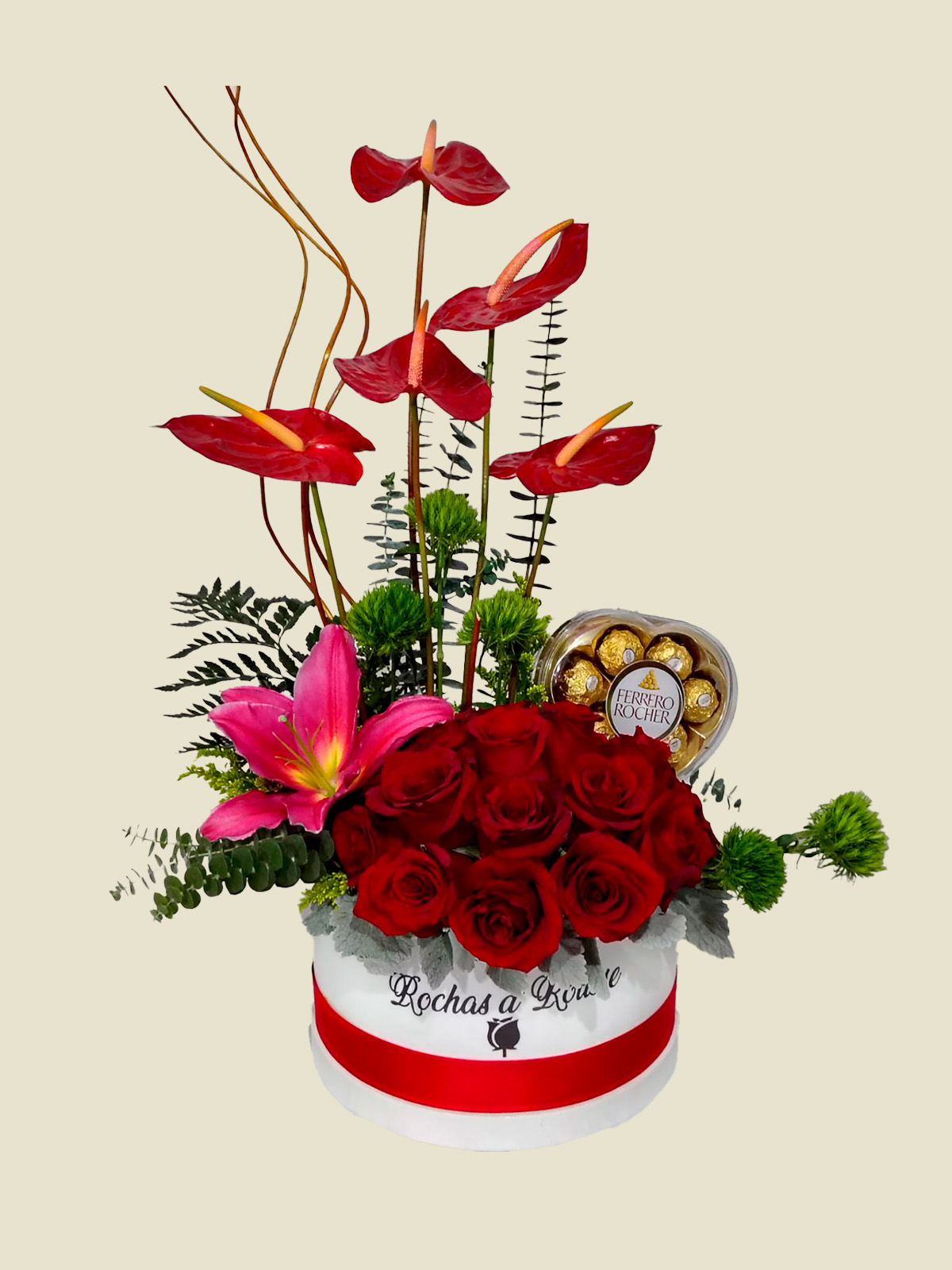 • Incluye: Rosas rojas de exportación, anturios rojos de tallo largo, lirios rosados, flores de relleno verdes, caja de chocolates Ferrero (corazón), base de caja de lujo y lazo decorativo.