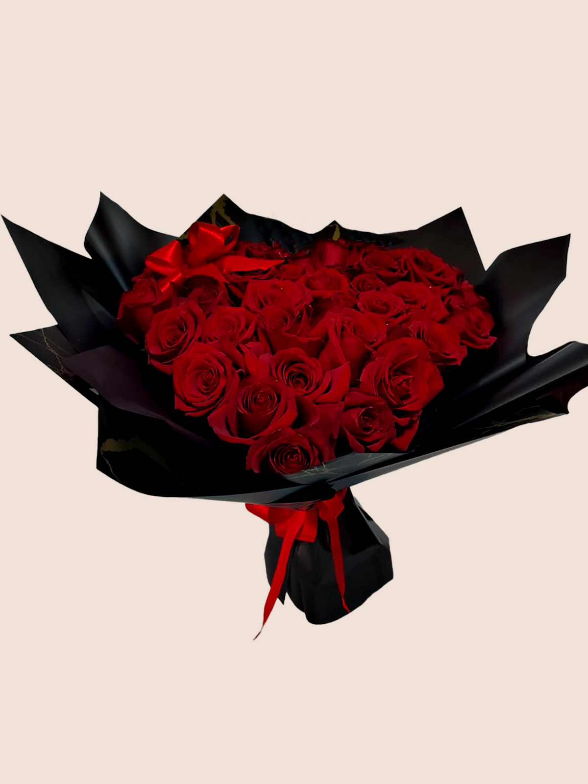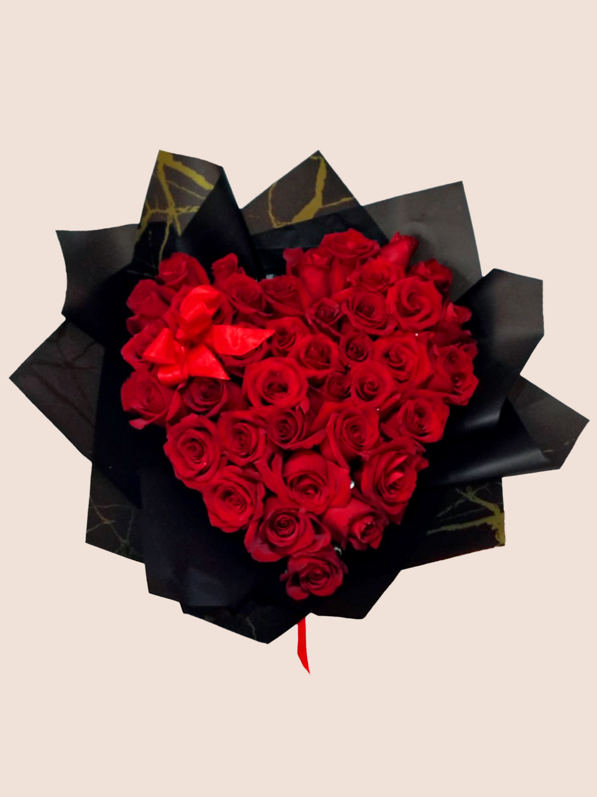 Expresa tus sentimientos con la máxima elegancia. Este ramo exclusivo ha sido diseñado cuidadosamente para que sus rosas rojas de exportación formen una silueta de corazón perfecta, visible desde cualquier ángulo. Enmarcado en papel coreano de alta calidad en tono negro, este ramo combina el romanticismo clásico con una estética moderna y sofisticada. Es el regalo ideal para dejar sin palabras a esa persona especial con un detalle que irradia amor y distinción.