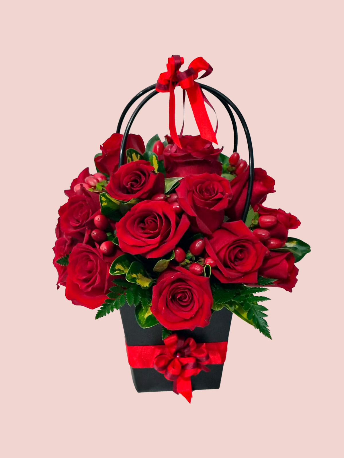 La elegancia clásica se encuentra con el diseño moderno en nuestro modelo. Una cartera caja negra que resalta el rojo intenso de nuestras rosas seleccionadas, complementadas con follaje verde y bayas decorativas que aportan textura y frescura. Su diseño con asa lo convierte en un detalle práctico y distinguido, ideal para sorprender en cualquier lugar.