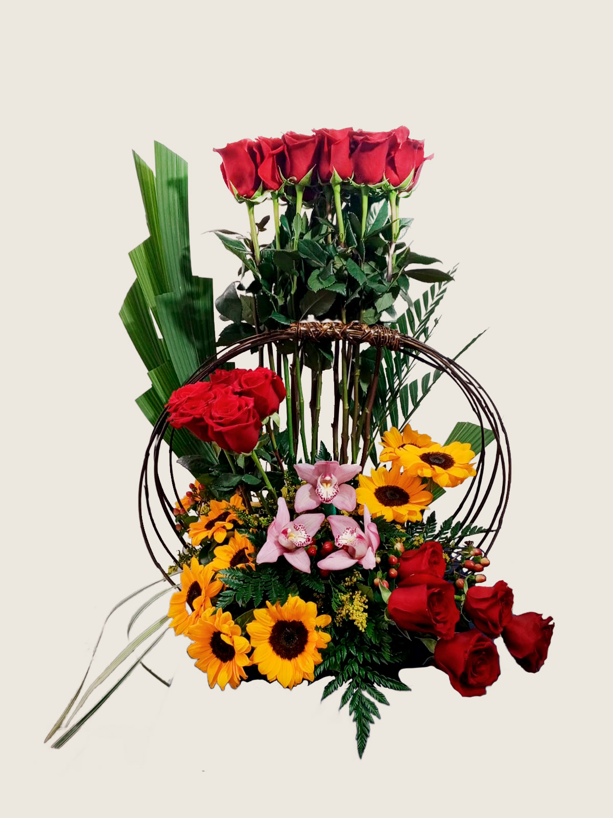 Eleva tus momentos especiales con una pieza de diseño floral vanguardista. Este arreglo destaca por su imponente estructura multinivel, coronada por una hilera perfecta de rosas rojas de exportación que aportan una elegancia lineal única. En su base, la calidez de los girasoles seleccionados se entrelaza con la delicadeza de las orquídeas, creando un contraste de texturas y colores que cautiva a primera vista. Es el regalo ideal para quienes buscan salir de lo convencional y entregar una verdadera obra de arte natural.