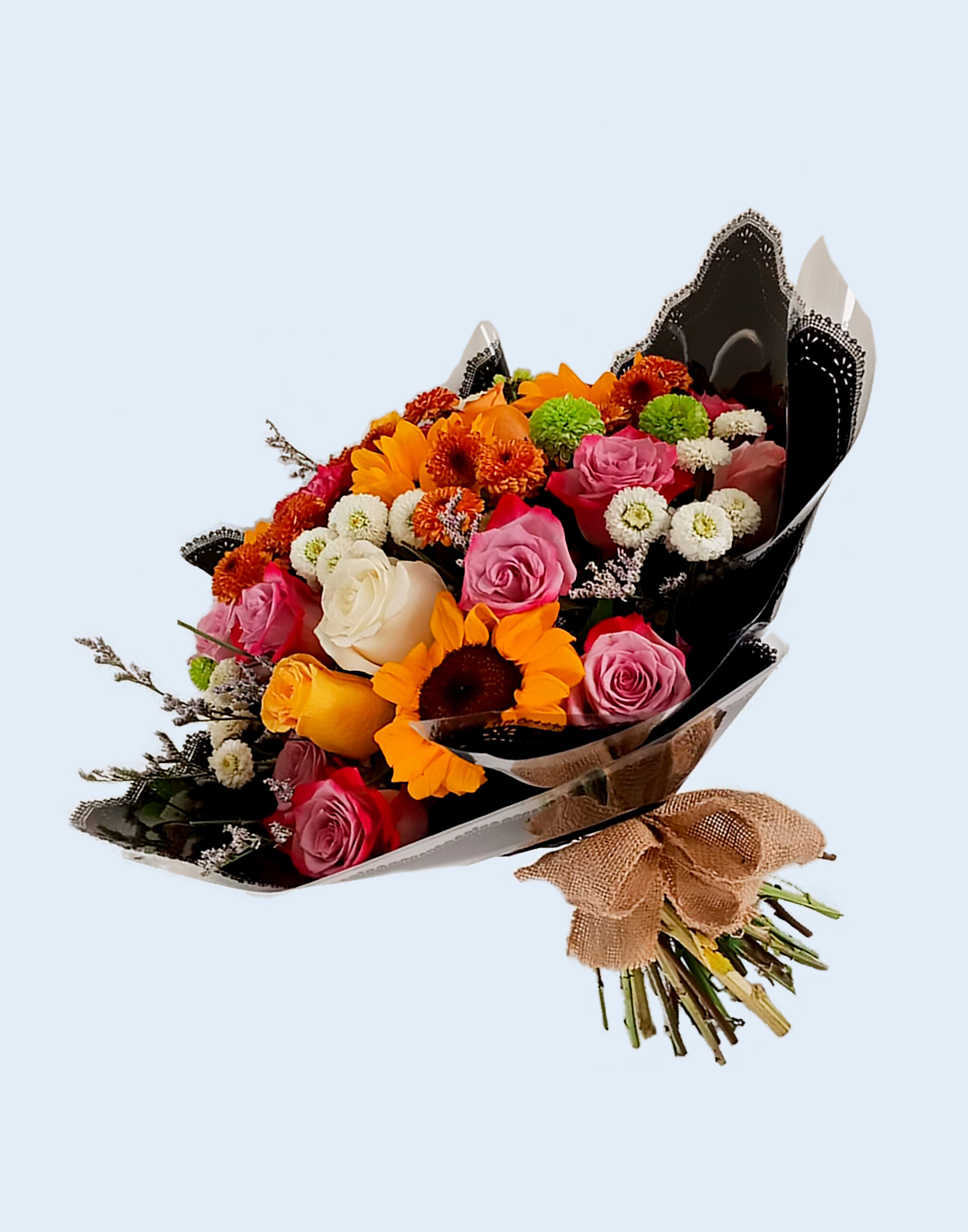 Incluye: Girasoles, rosas multicolores premium, crisantemos tipo pompón, flores de acento, follaje fino y envoltorio artístico con lazo de yute rústico.