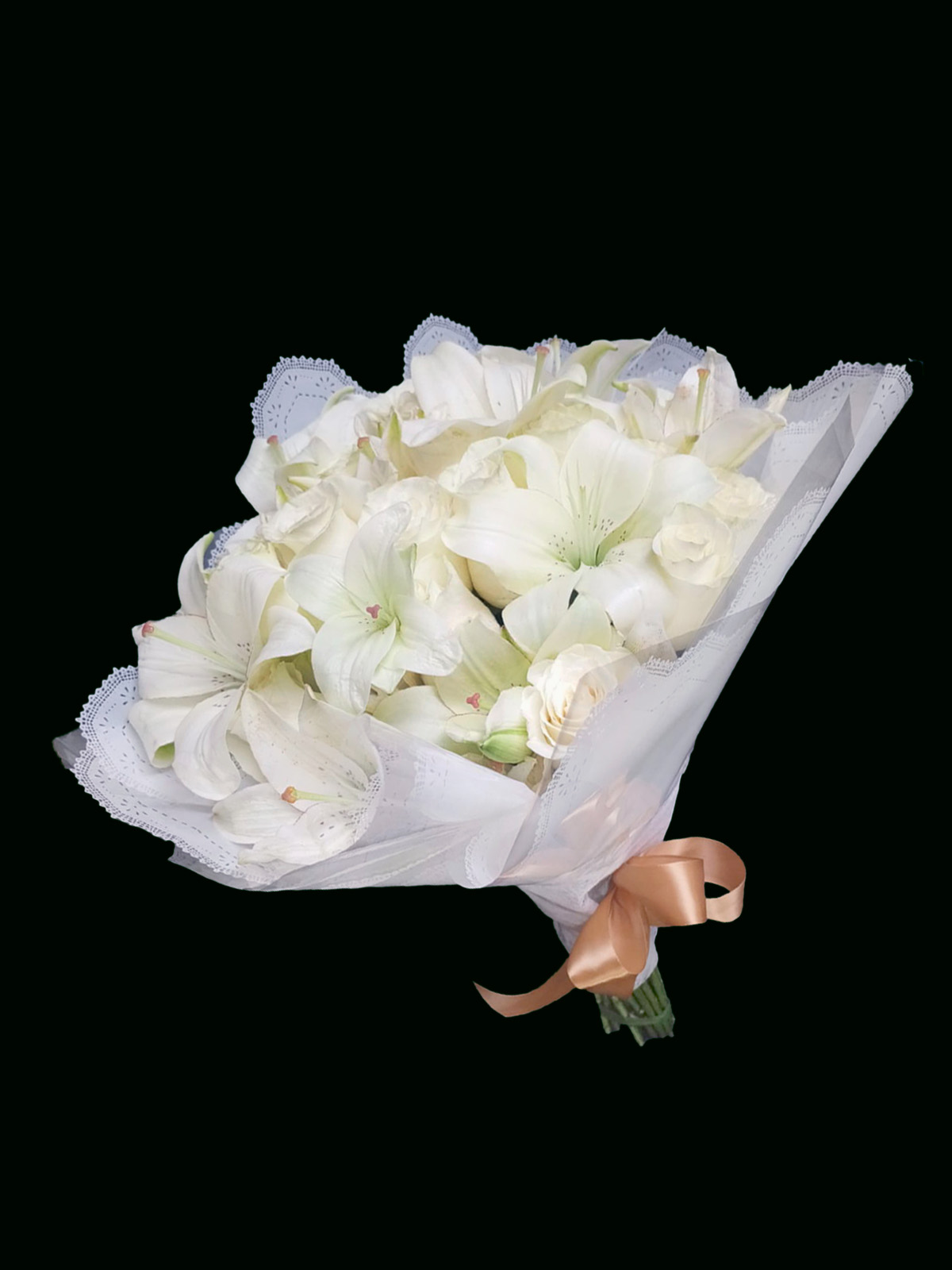 • Incluye: Lirios blancos de exportación, rosas blancas premium, follaje fino, envoltorio de tul artístico y lazo de satén.