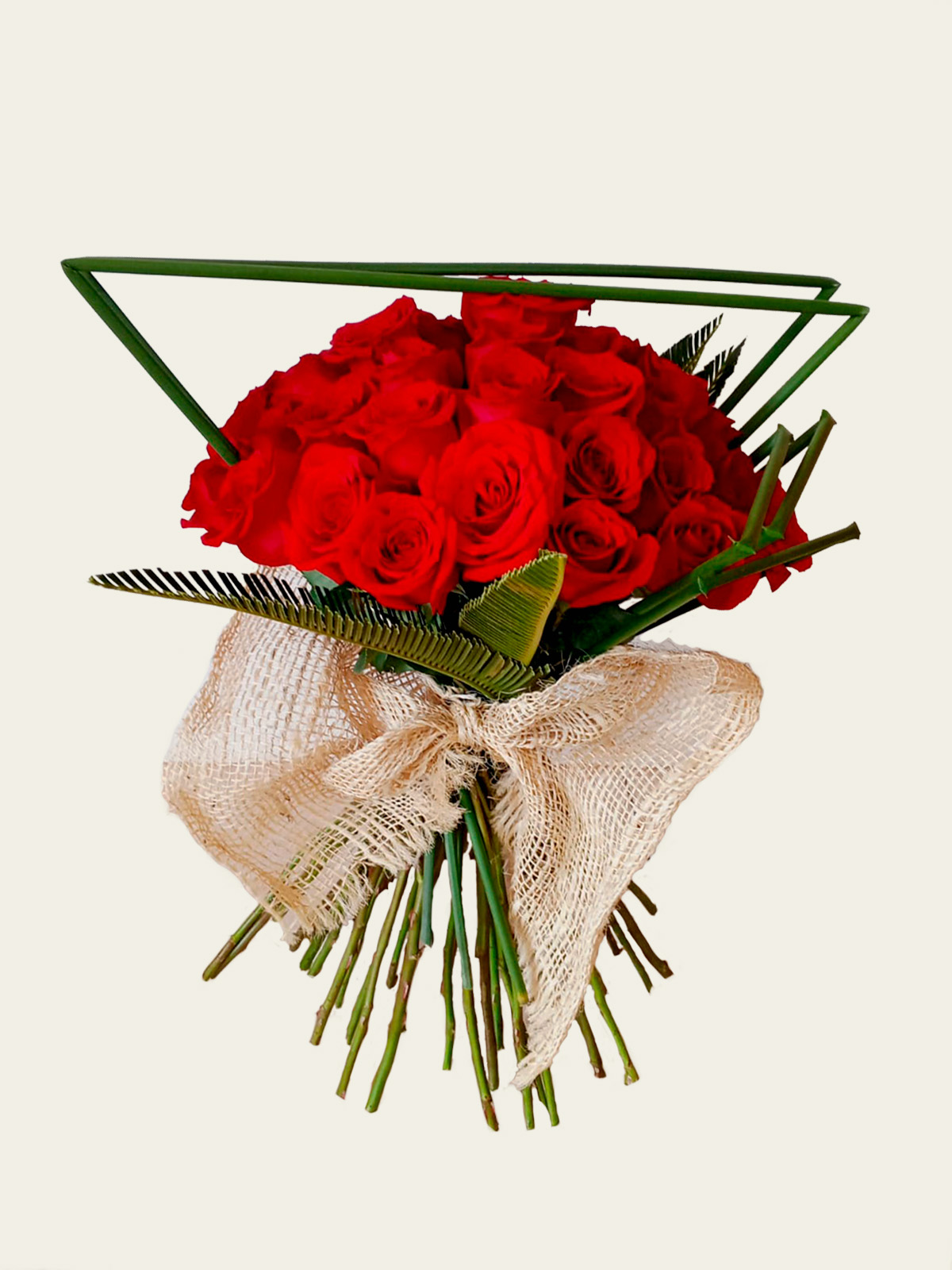 Incluye: Rosas rojas de exportación de tallo largo, estructura geométrica de follaje lineal, envoltorio de yute natural y lazo decorativo.