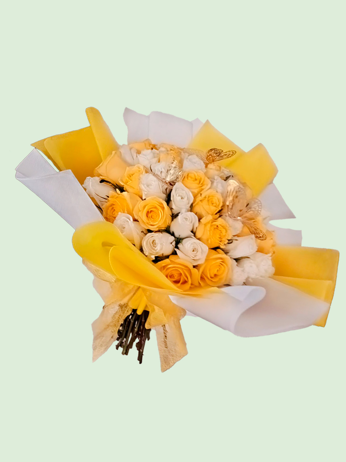 • Incluye: Rosas amarillas premium, rosas blancas seleccionadas, detalles ornamentales de mariposas doradas y envoltorio artístico de lujo.