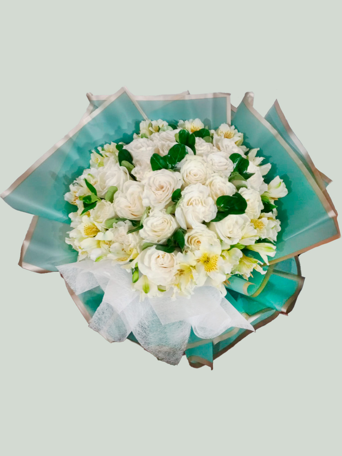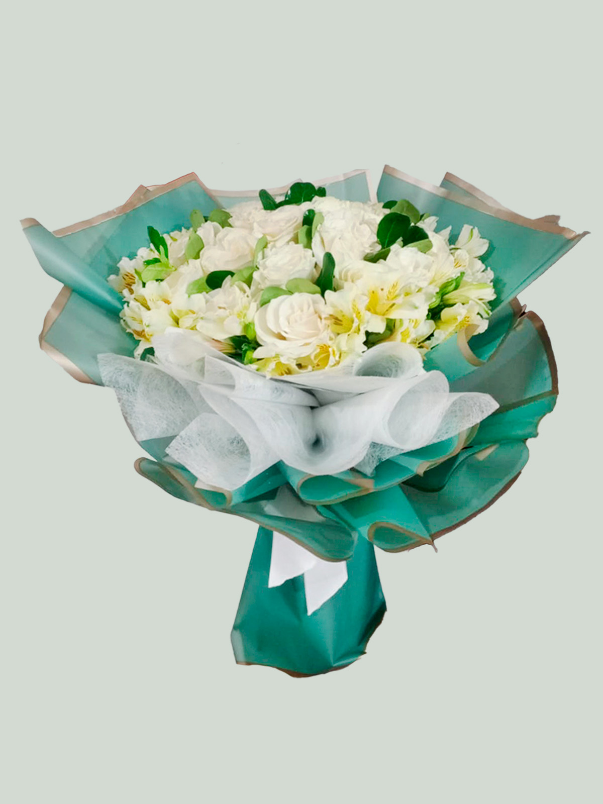 Conmueve con una composición que evoca pureza y distinción en cada detalle. Este bouquet de mano cautiva por su luminosa combinación de rosas blancas premium y astromelias en tonos crema, realzadas por el contraste vibrante del follaje verde intenso. Su envoltorio artístico en capas de color verde esmeralda y blanco traslúcido distingue este diseño como una pieza de alta sofisticación, ideal para transmitir paz, gratitud o una admiración sincera con un toque de frescura natural.