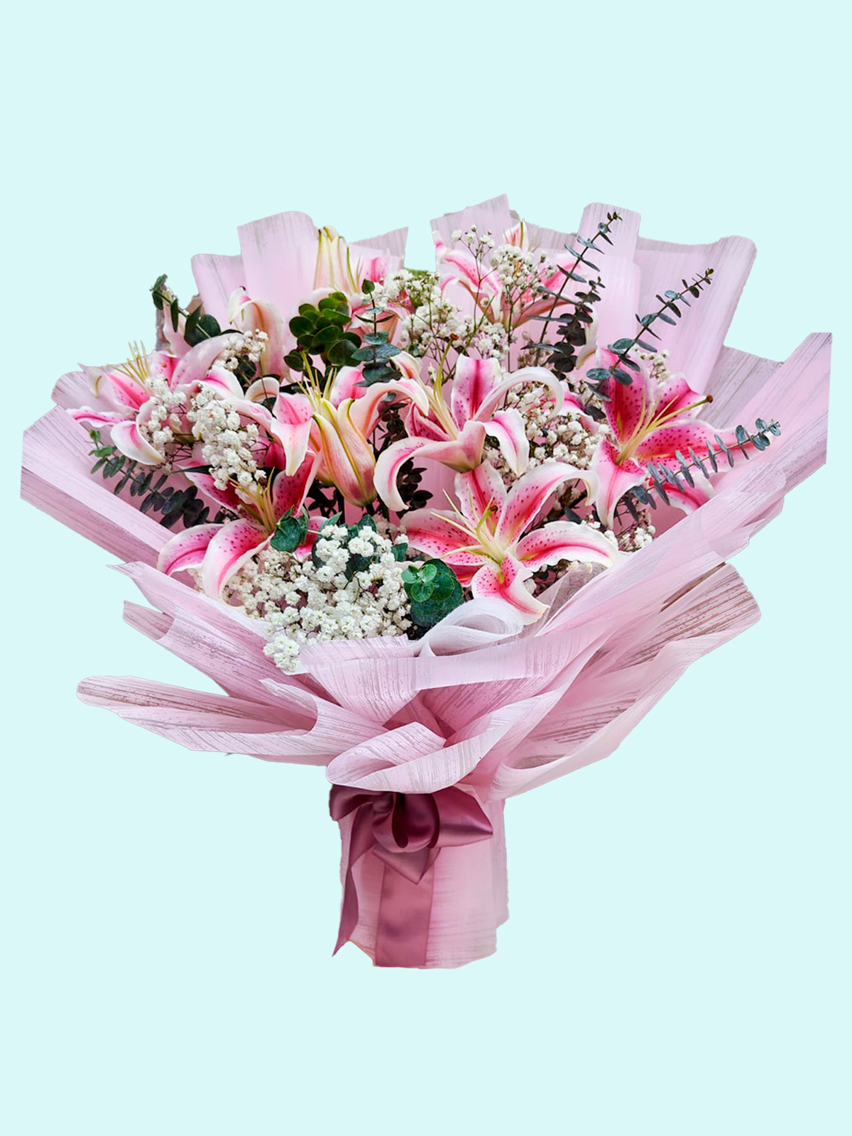 Eleva tus emociones con una composición que exhala frescura y distinción. Este majestuoso bouquet de mano destaca por la elegancia de sus lirios matizados en tonos rosados, complementados con la delicadeza del gypsophila y toques silvestres de eucalipto. Envuelto en un diseño artístico de papel coreano texturizado en rosa suave, este arreglo es la expresión perfecta de ternura y buen gusto.