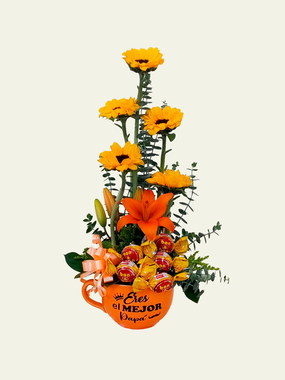 Incluye: Girasoles premium dispuestos en niveles, lirios (Liliums) color naranja, follaje de eucalipto fresco, variedad de bombones Bon o Bon, y taza decorativa de cerámica con diseño «Eres el mejor papá».