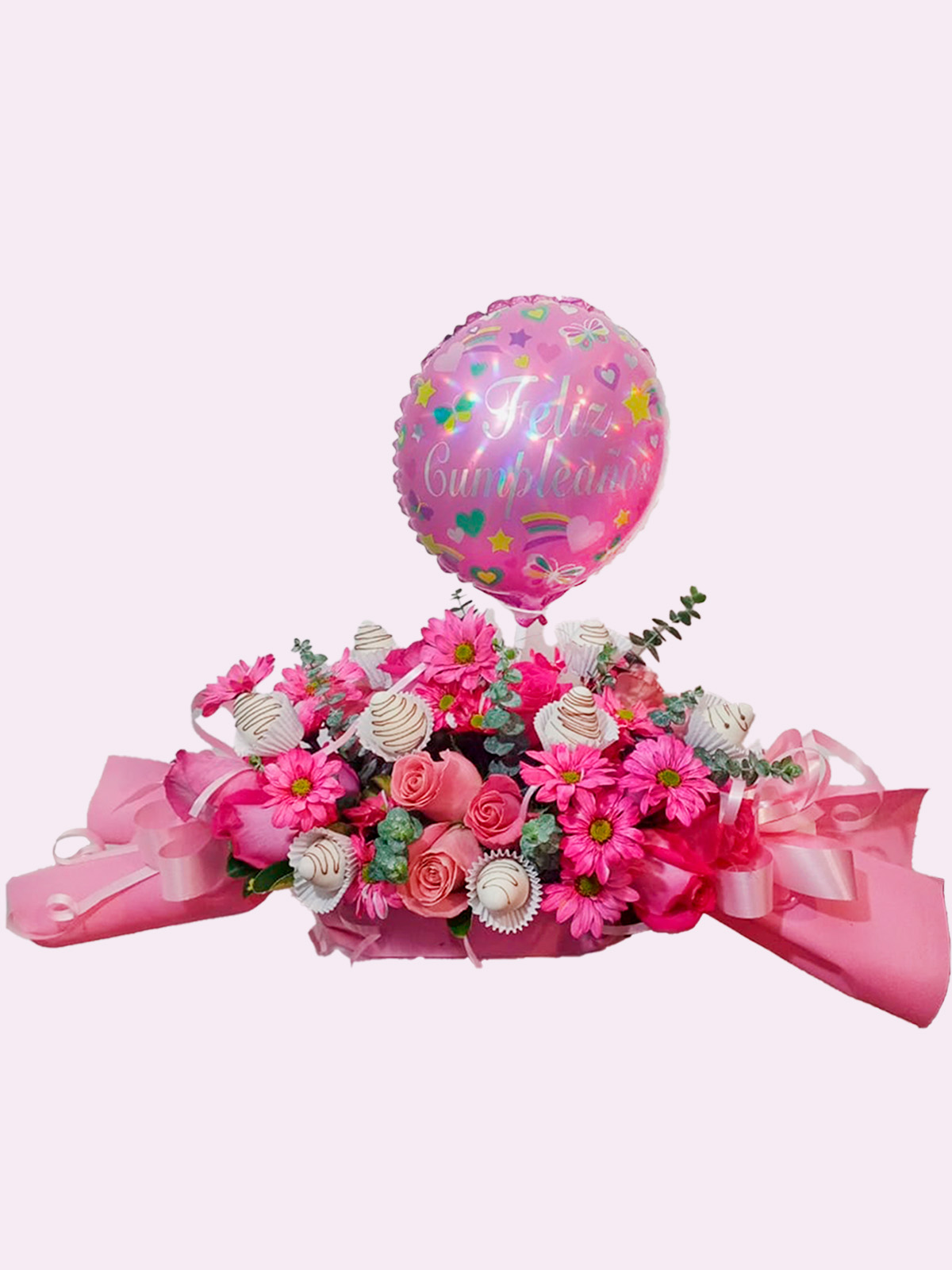 Incluye: Rosas rosadas premium, margaritas color fucsia, fresas cubiertas con chocolate blanco artesanal, follaje de eucalipto, globo metalizado de «Feliz Cumpleaños», lazos de organza y base decorativa con envoltorio rosa.