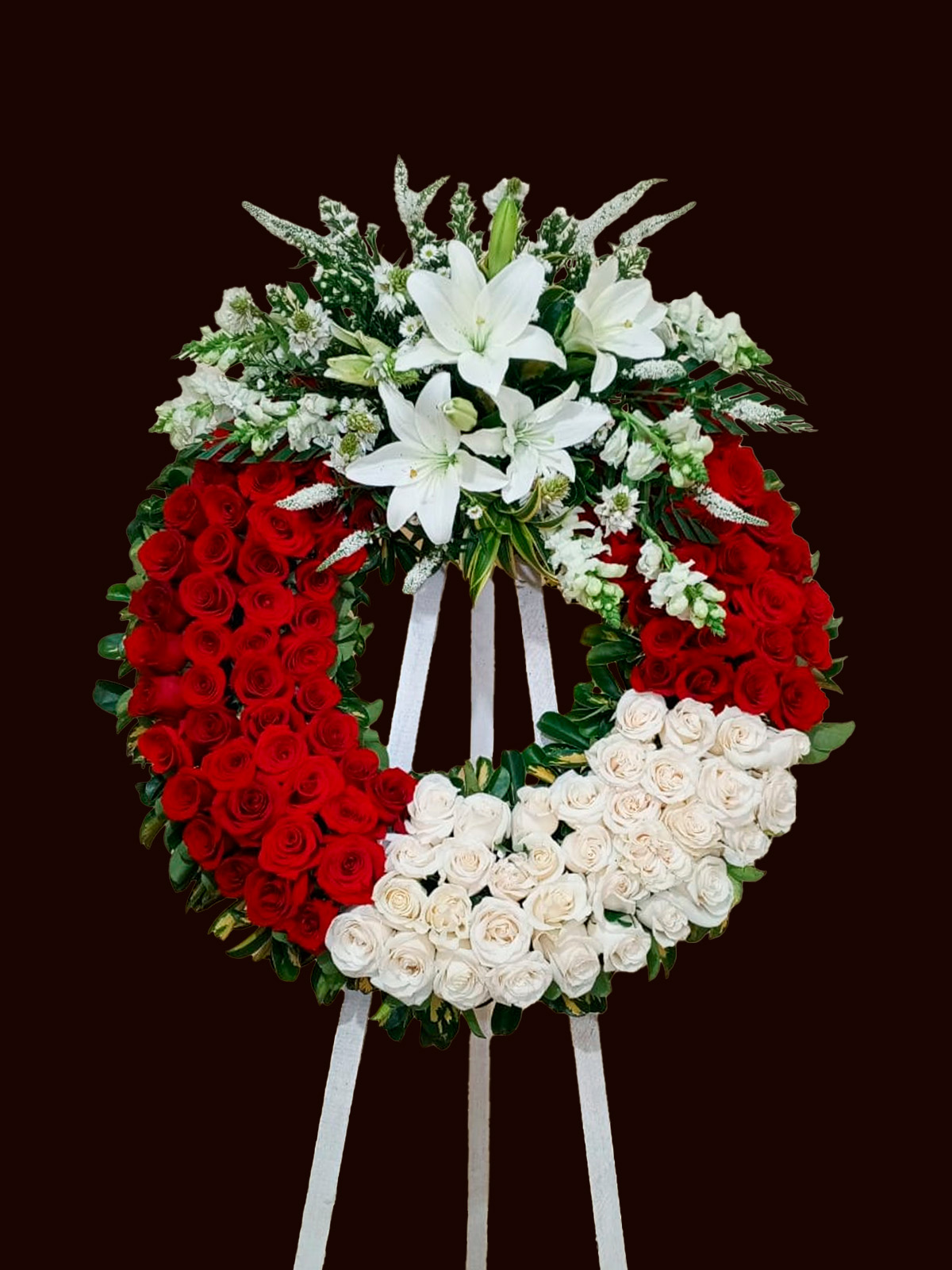 Esta corona de gran formato presenta una estética bicolor que simboliza el amor y la pureza en un último adiós. Su estructura circular está meticulosamente tapizada con rosas rojas y blancas de exportación, creando un patrón visual sereno y distinguido. La parte superior destaca por un arreglo elegante de lirios blancos y flores de complemento, que aportan una sensación de luz y consuelo para acompañar a los familiares en momentos de despedida.