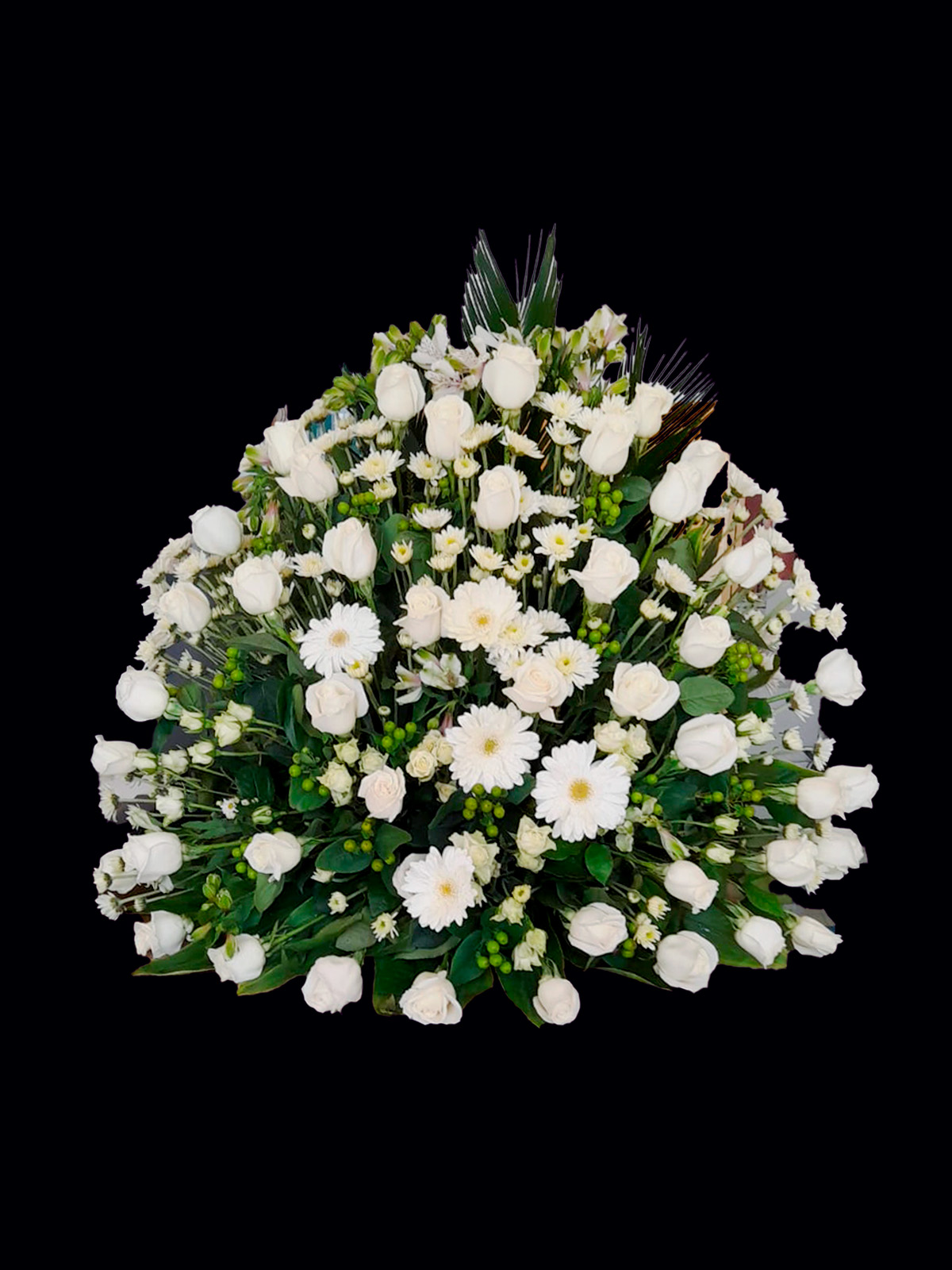 Este arreglo de formato medio destaca por su diseño semiesférico y la densidad de sus componentes, proyectando una imagen de armonía y consuelo. La composición reúne rosas blancas de exportación, gerberas y delicadas astromelias, creando una textura floral rica y equilibrada. Acompañado de follaje verde brillante y detalles de bayas ornamentales, esta pieza es una elección sobria para honrar la memoria de un ser querido con elegancia y distinción.