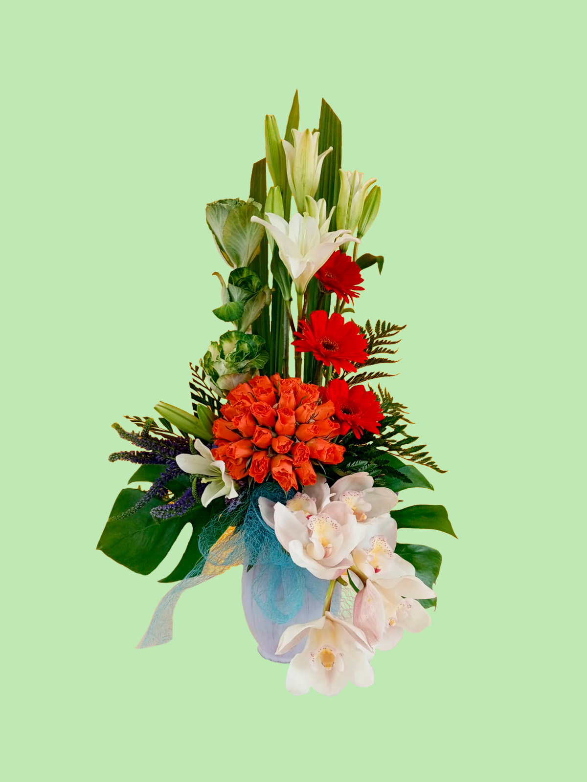 • Incluye: Orquídeas blancas premium, rosas naranja, lirios blancos, gerberas rojas, follaje exótico (hojas de monstera) y base decorativa.