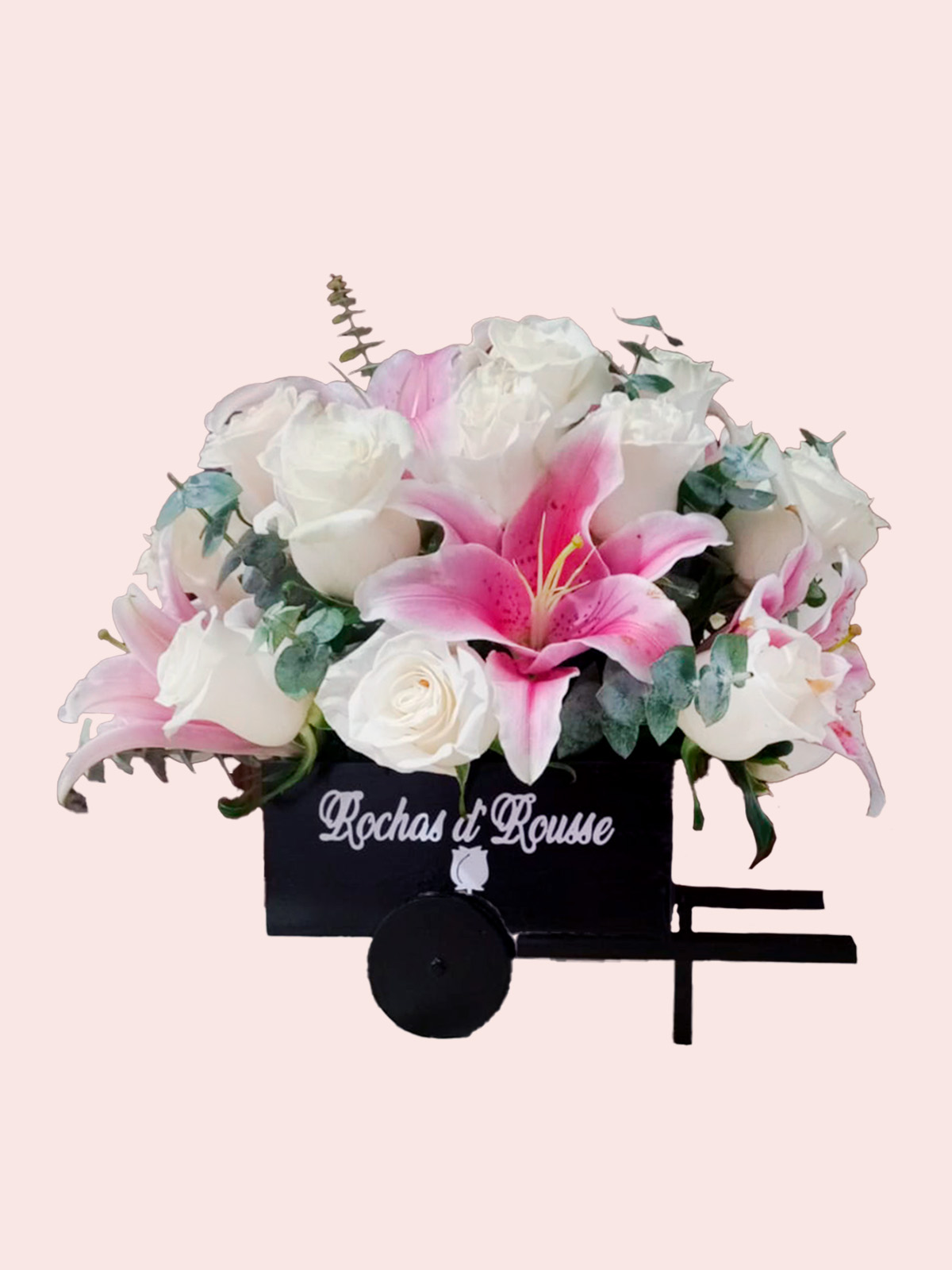 Incluye: Rosas blancas de exportación, lirios pink en apertura, follaje selecto de eucalipto baby blue, carreta decorativa de madera con logo Rochas d’ Rousse y acabados premium.