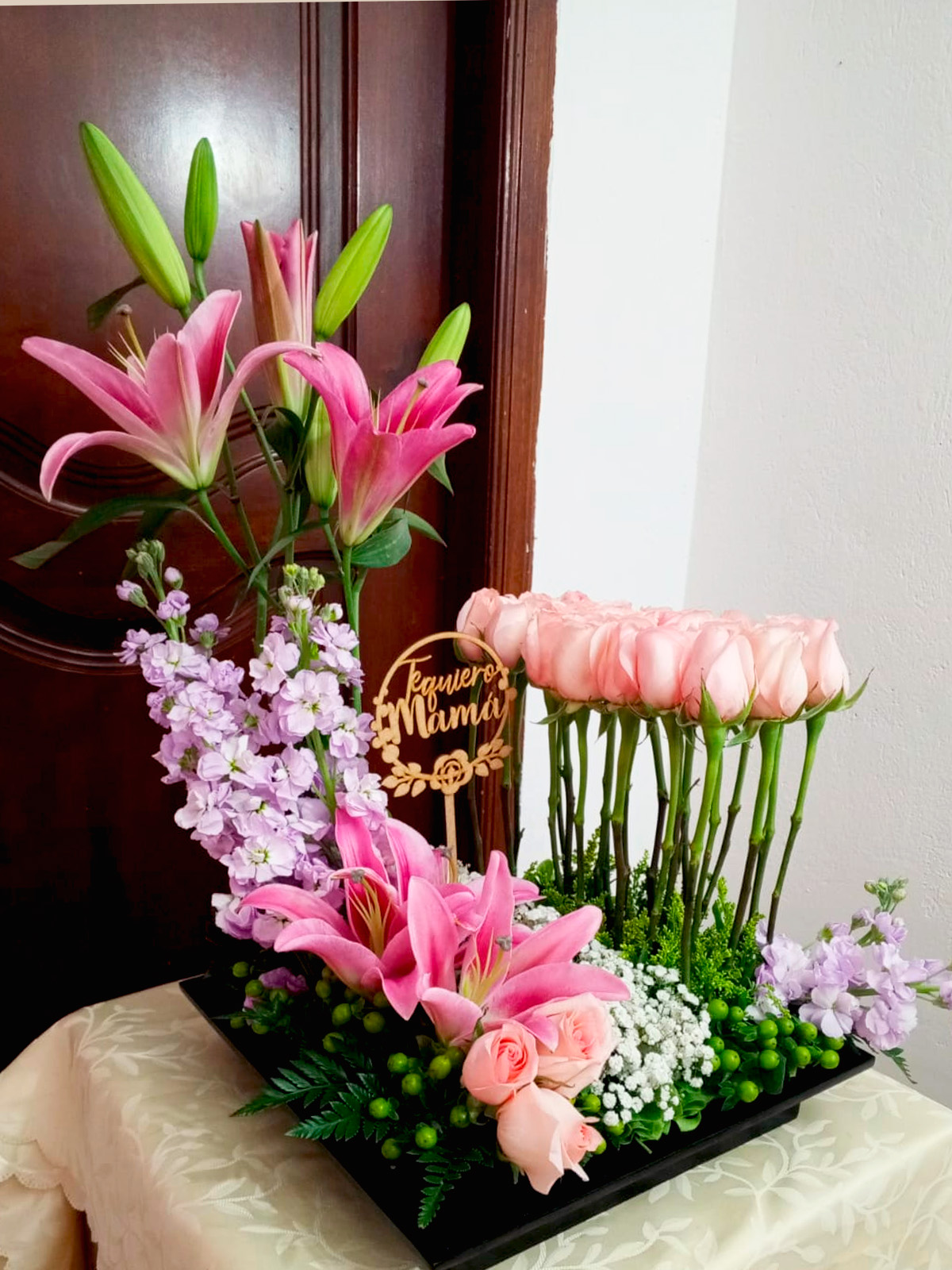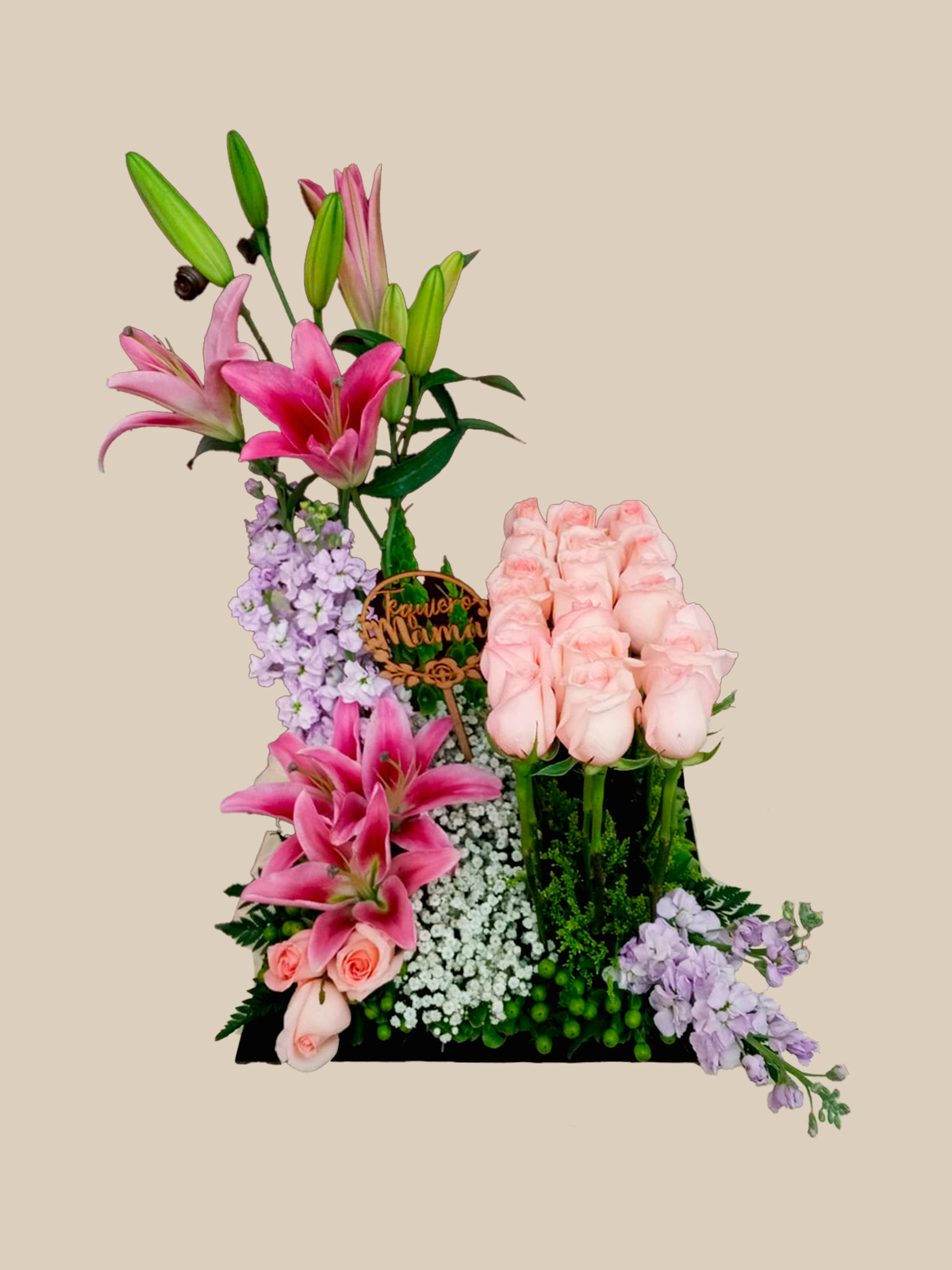 Este arreglo floral de autor presenta una composición equilibrada que juega con diferentes alturas y texturas. El diseño se caracteriza por un ramillete vertical de lirios (liliums) rosa en plena apertura, que contrastan con una formación lineal de rosas en tono durazno pálido. Acentos de flores silvestres en color lila y una base de gipsofilia blanca aportan frescura y volumen, mientras que el topper de madera «Te quiero Mamá» añade un toque sentimental personalizado, convirtiéndolo en una pieza decorativa única y sofisticada.