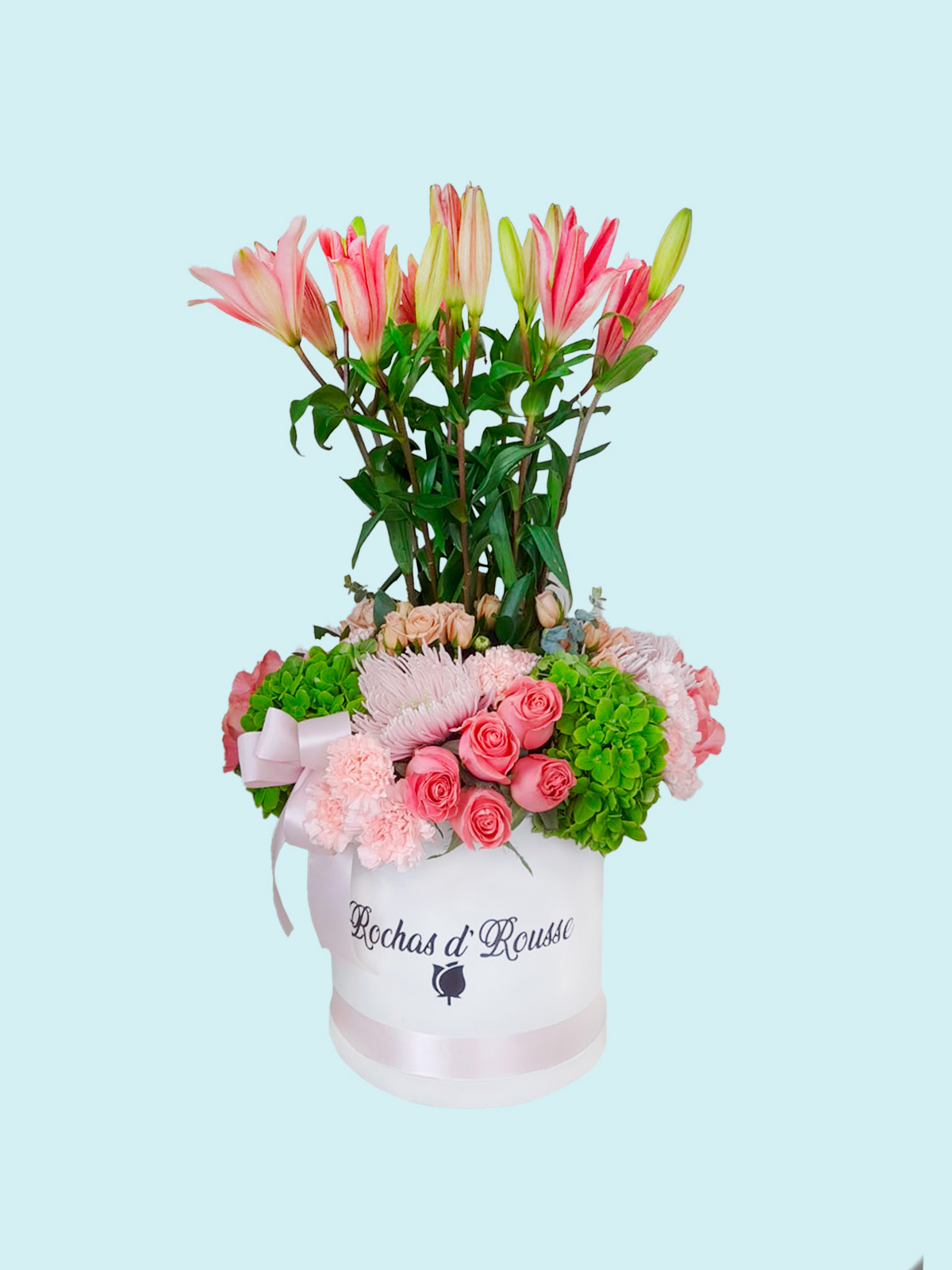 Incluye: Lirios rosados premium de tallo largo, rosas mini en tonos coral, hortensias verdes vibrantes, claveles rosa pálido, caja decorativa blanca de alta calidad con marca frontal y lazo de seda.