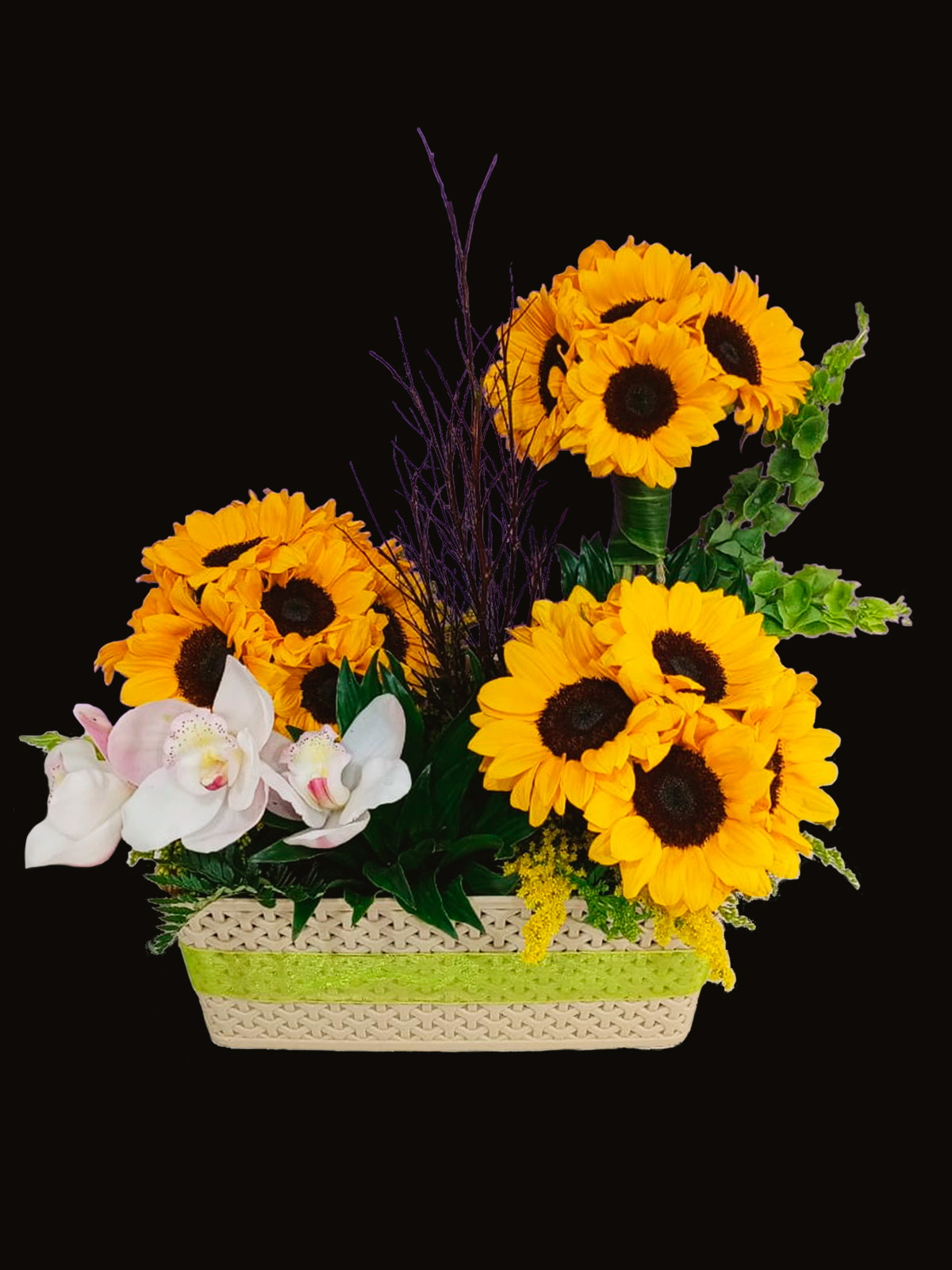 Este diseño de autor es una oda a la sofisticación natural, fusionando la energía vibrante de los girasoles de exportación con la elegancia atemporal de las orquídeas. La composición se organiza en agrupaciones densas que crean focos visuales de lujo, complementados con texturas lineales y una base tejida que aporta un toque orgánico y refinado. Es una pieza pensada para destacar y cautivar.