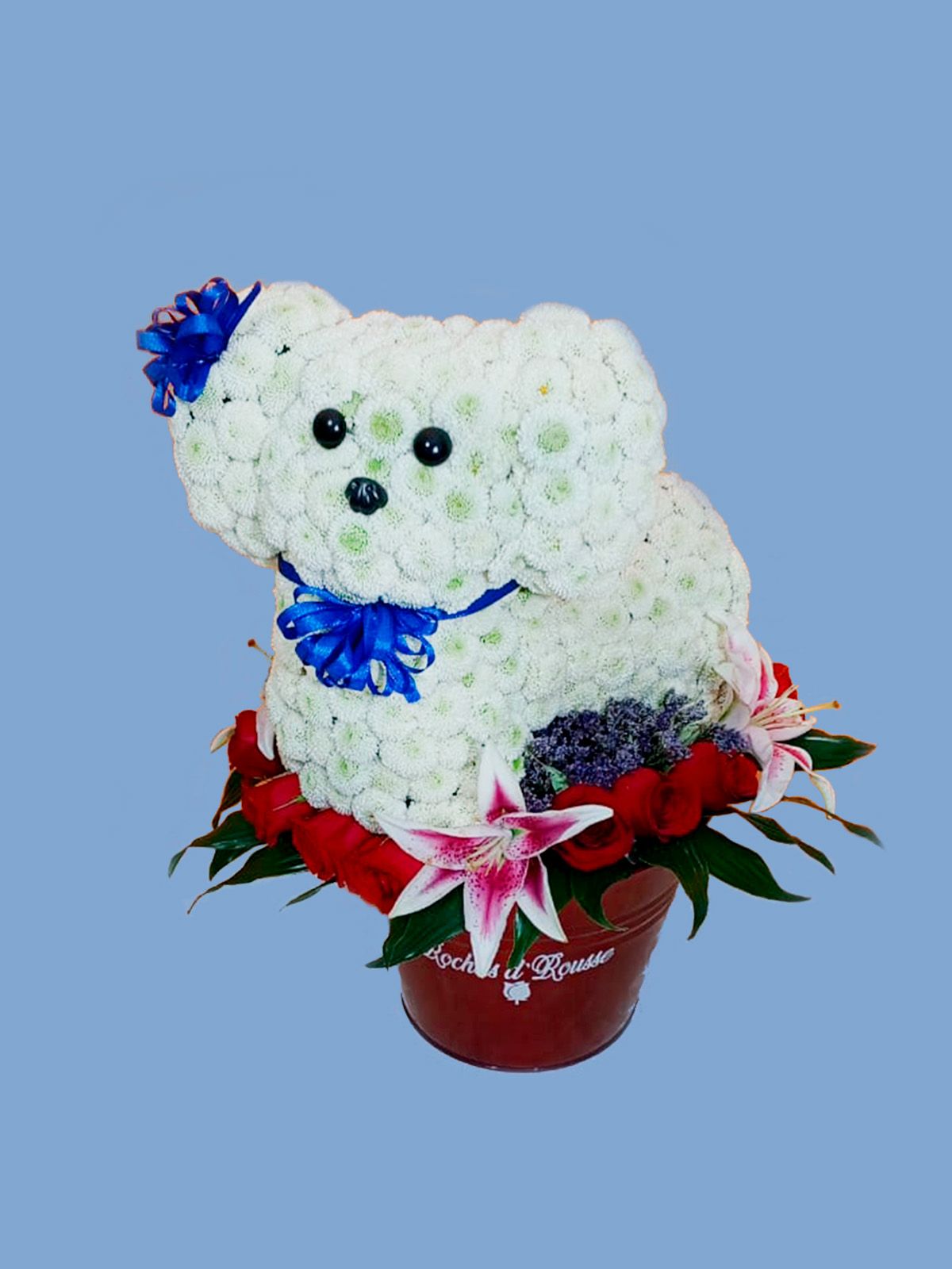 • Diseño detallado: Figura de perrito elaborada con flores blancas de alta densidad, decorada con cintas azules en la oreja y el cuello para un estilo único.